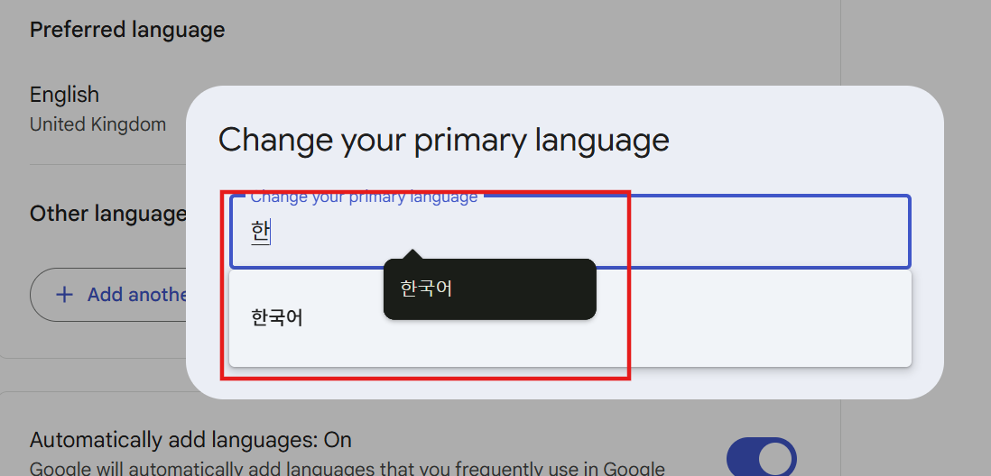 누르면 새로운 화면이 나오는데 거기 빈칸에 한국어 라고 입력 해주세요.