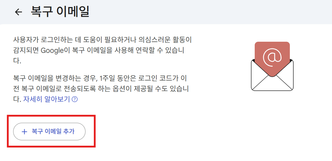 복구 이메일로 들어오시면 복구 이메일 추가 버튼을 클릭 합니다.