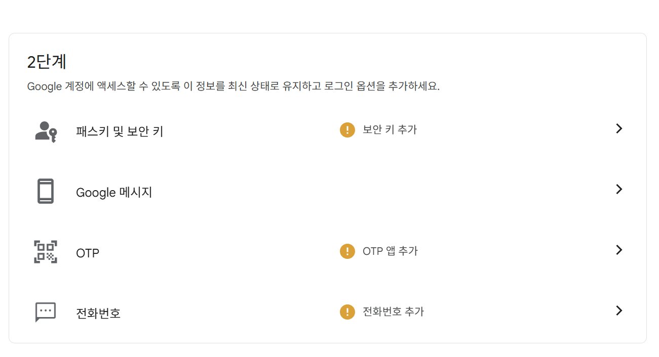 2단계 인증에 들어 가시면 패스키, 구글 메세지, OTP, 전화 번호 추가가 있습니다.