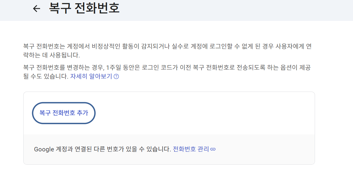 복구 전화번호 추가를 누르시면 새로운 창이 나옵니다.