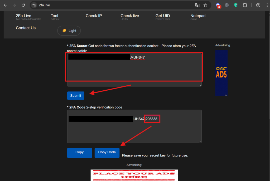 Submit 을 클릭하면 아래 창에 2fa code 와 함께 6자리 코드가 생성 됩니다.