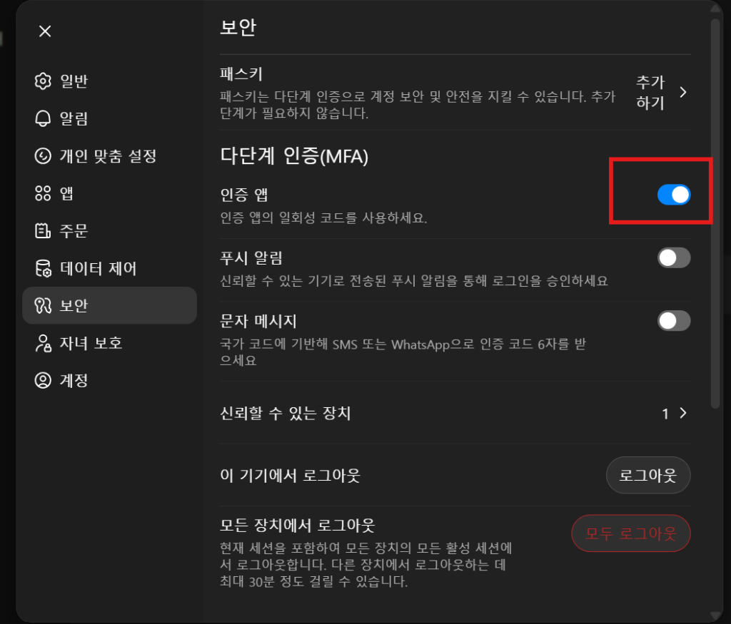 설정 – 보안 으로 들어가면 다단계 인증 이라고 있습니다.