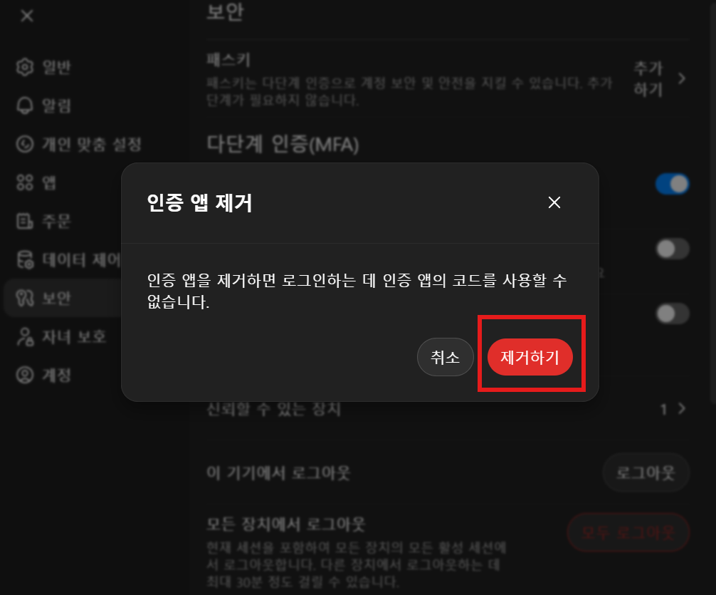 그러면 다단계 인증 버튼이 회색으로 변합니다.