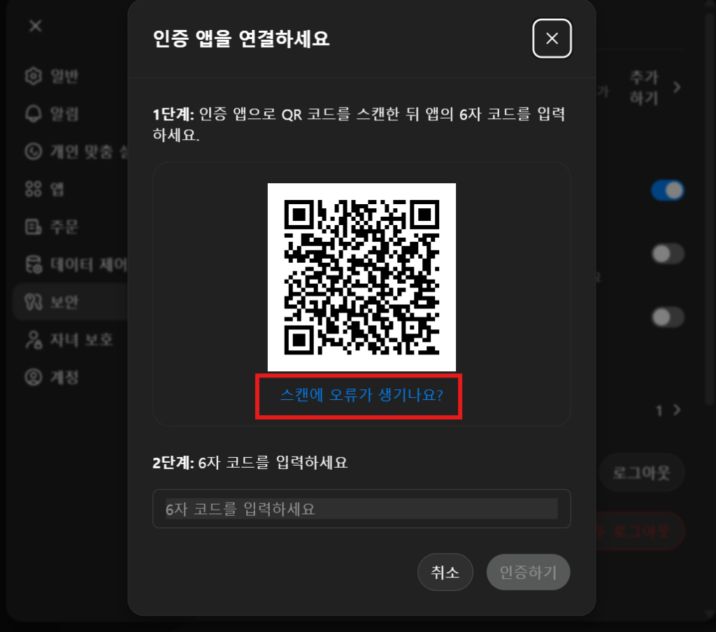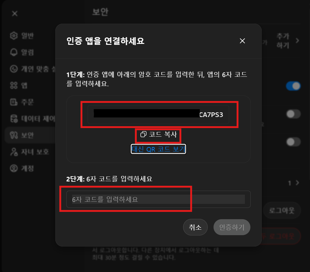 6자리 코드 나오면 복사하신 후 아랫 칸에 붙여 넣고 인증하기 눌러주세요.