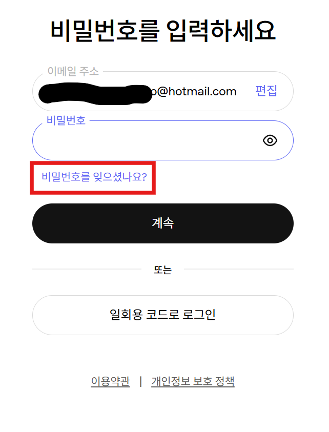 다음 창이 열리면 비밀번호를 잊으셨나요? 버튼을 눌러주세요.