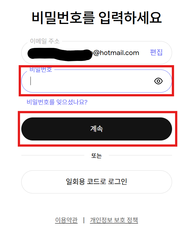 다시 로그인 창이 뜨고 새로운 비밀번호를 입력하고 계속 버튼을 클릭 해주세요.