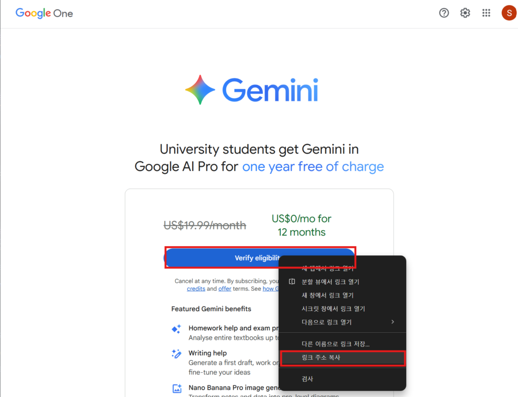 본인 구글 계정으로 구글원 (제미나이 프로) 활성화를 하려면 해당 프로모션 혜택 계정이 어야 합니다.