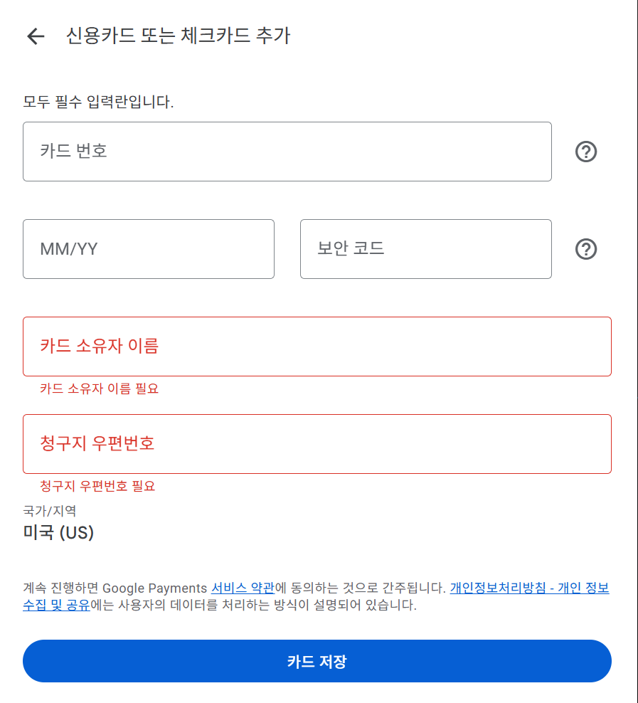 신용카드 또는 체크카드 추가를 클릭해주세요.