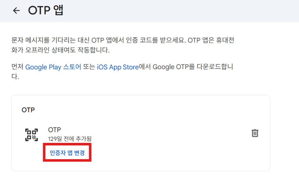 표시해둔 ‘인증자 앱 변경’ 을 클릭 합니다.